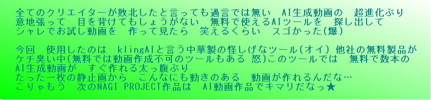 やっぱ 本命はこれでしょ 瞬きはするわ 胸揺れるは 手動かすは… 全く 指示してないのにAIが勝手に動きをつけたワケで もっと過激なシーンも 動画化しようと思ったんだが アカウント BANされそうなので遠慮しました (無料製品でも メールアドレスやパスワード等 個人情報の入力は 必要なので 注意) クリエーターを自称するなら 一度は 触ってみてもイイかもね |